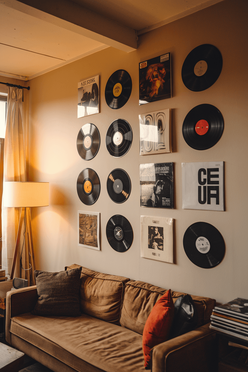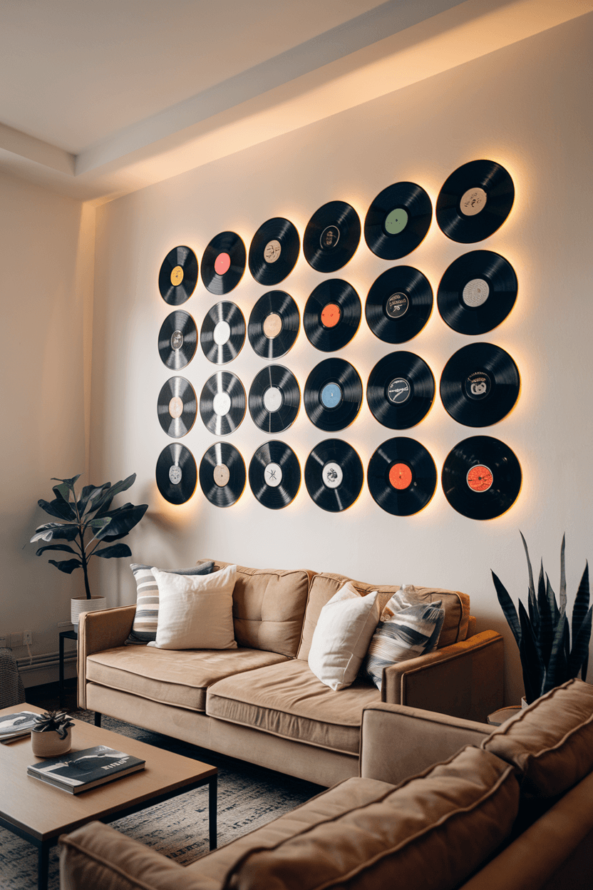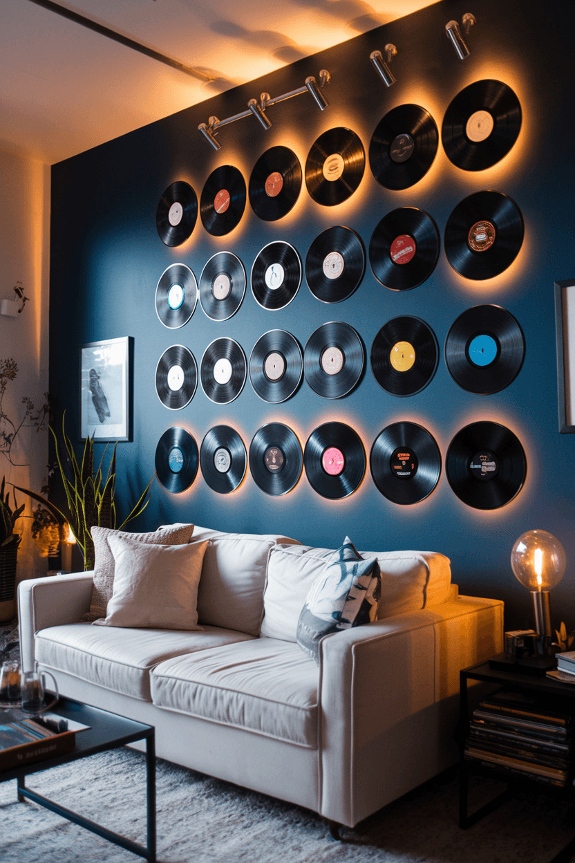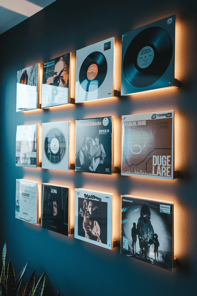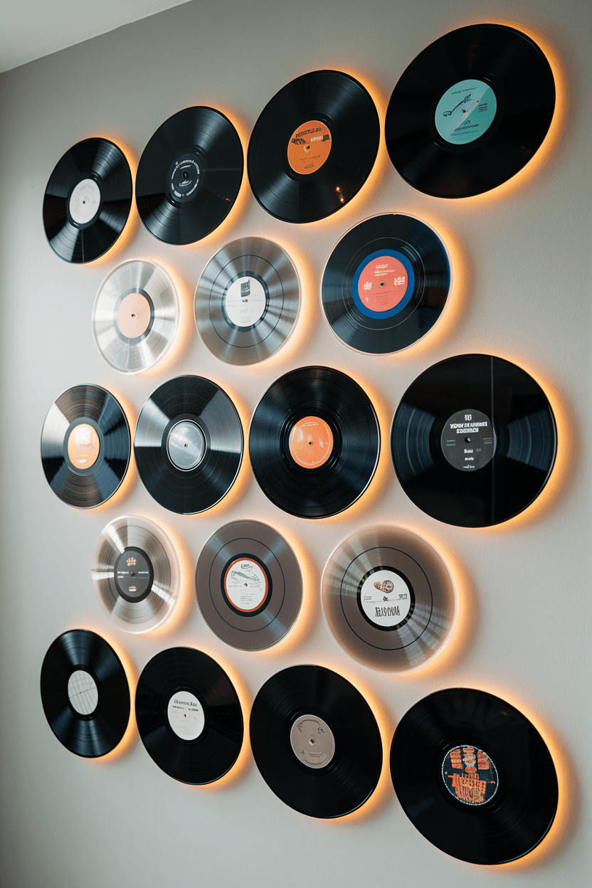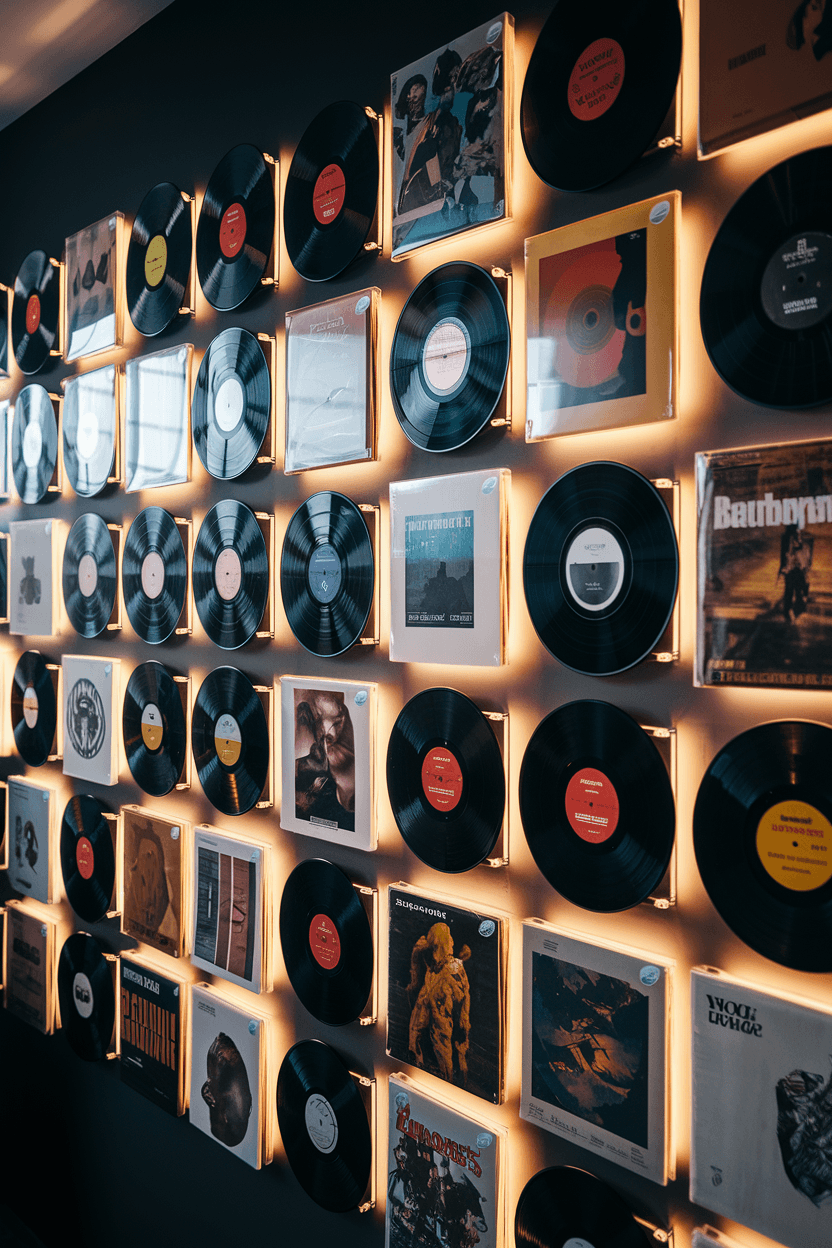 Highlight Vinyl Art: Strategic lighting can transform your vinyl wall into a luminous art piece. How about warm LED strips highlighting each record?