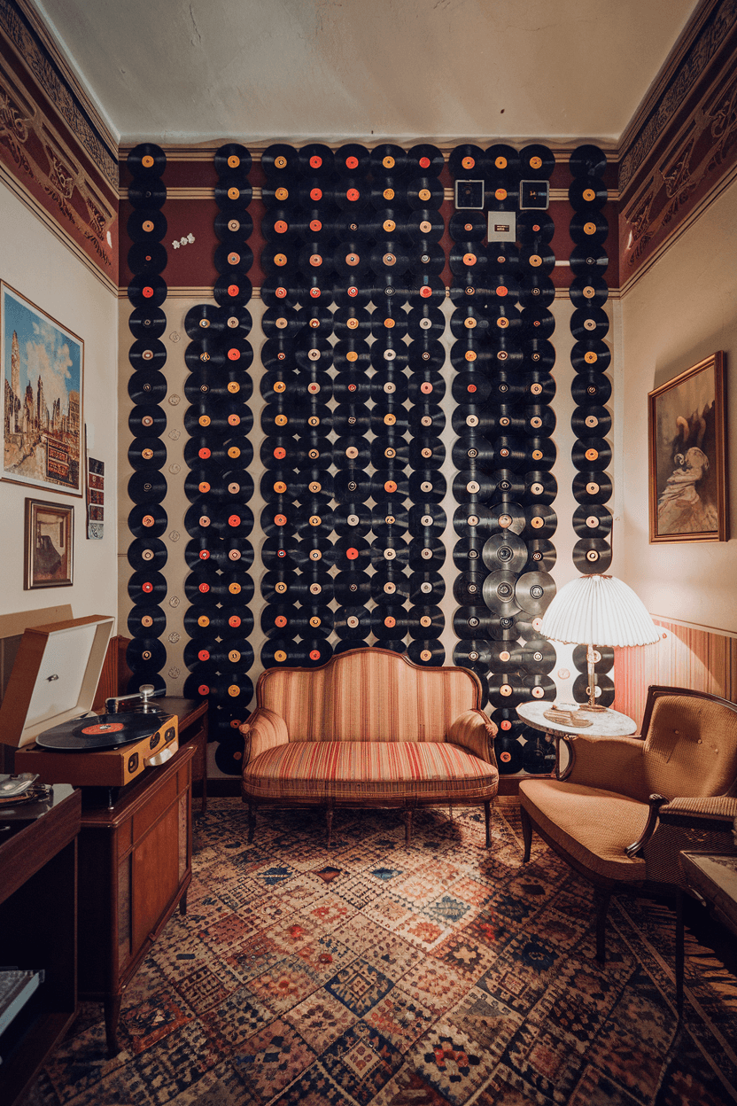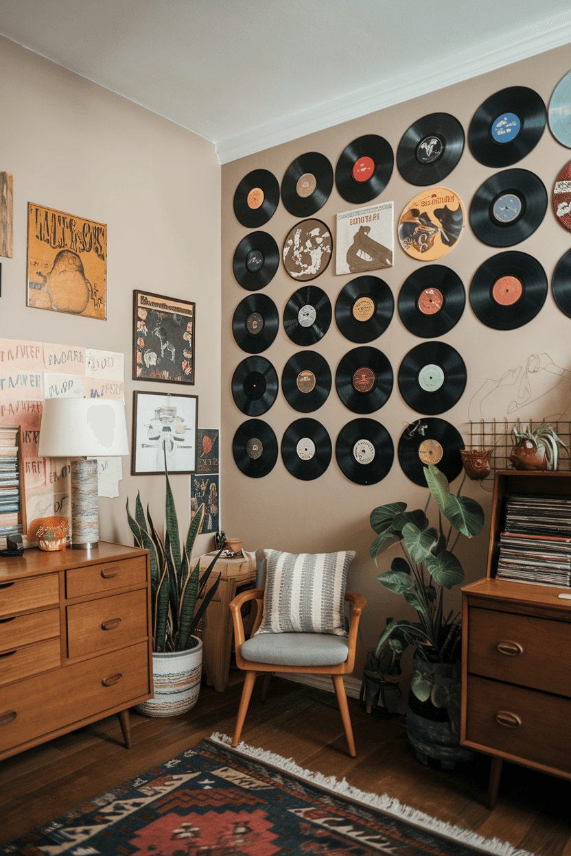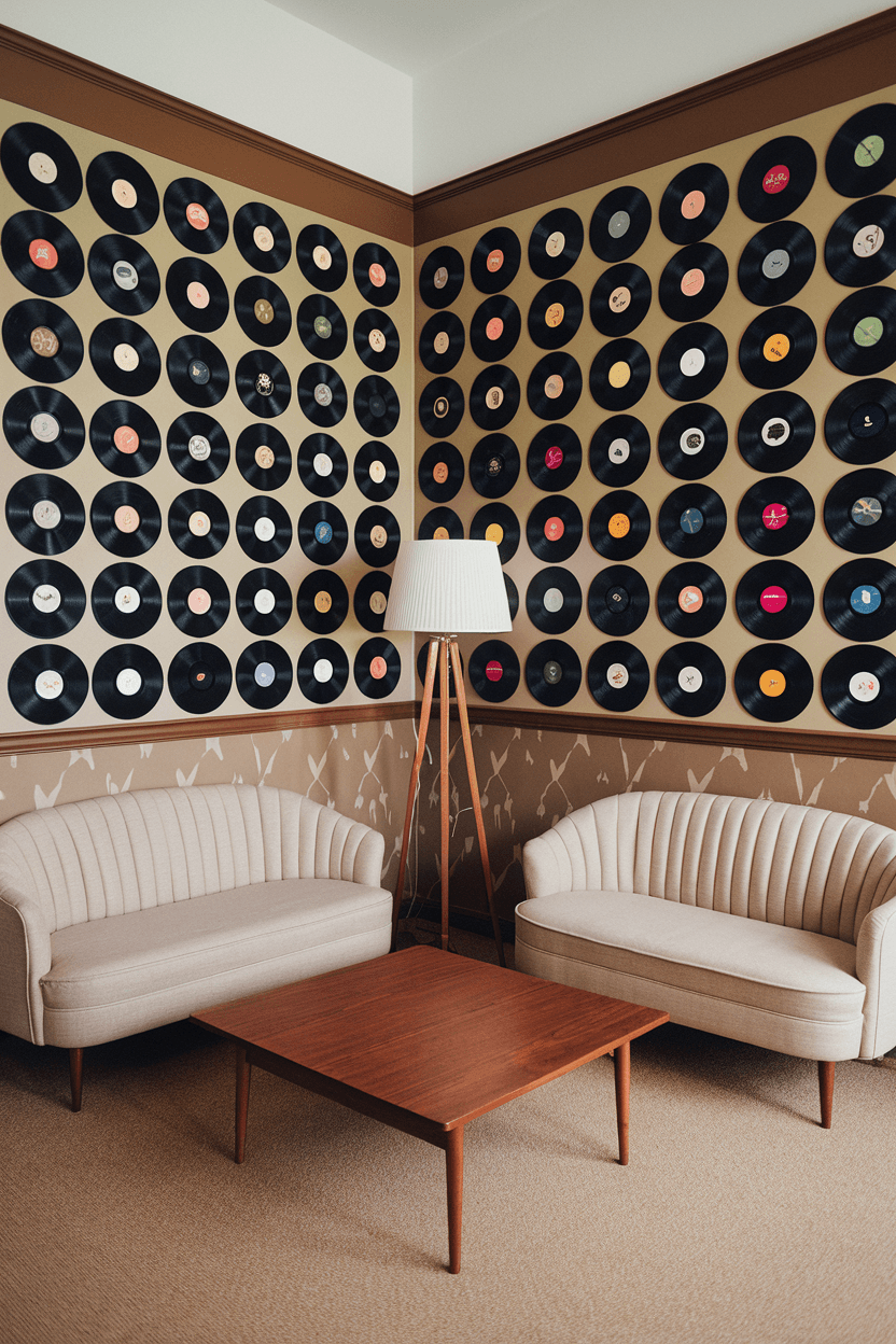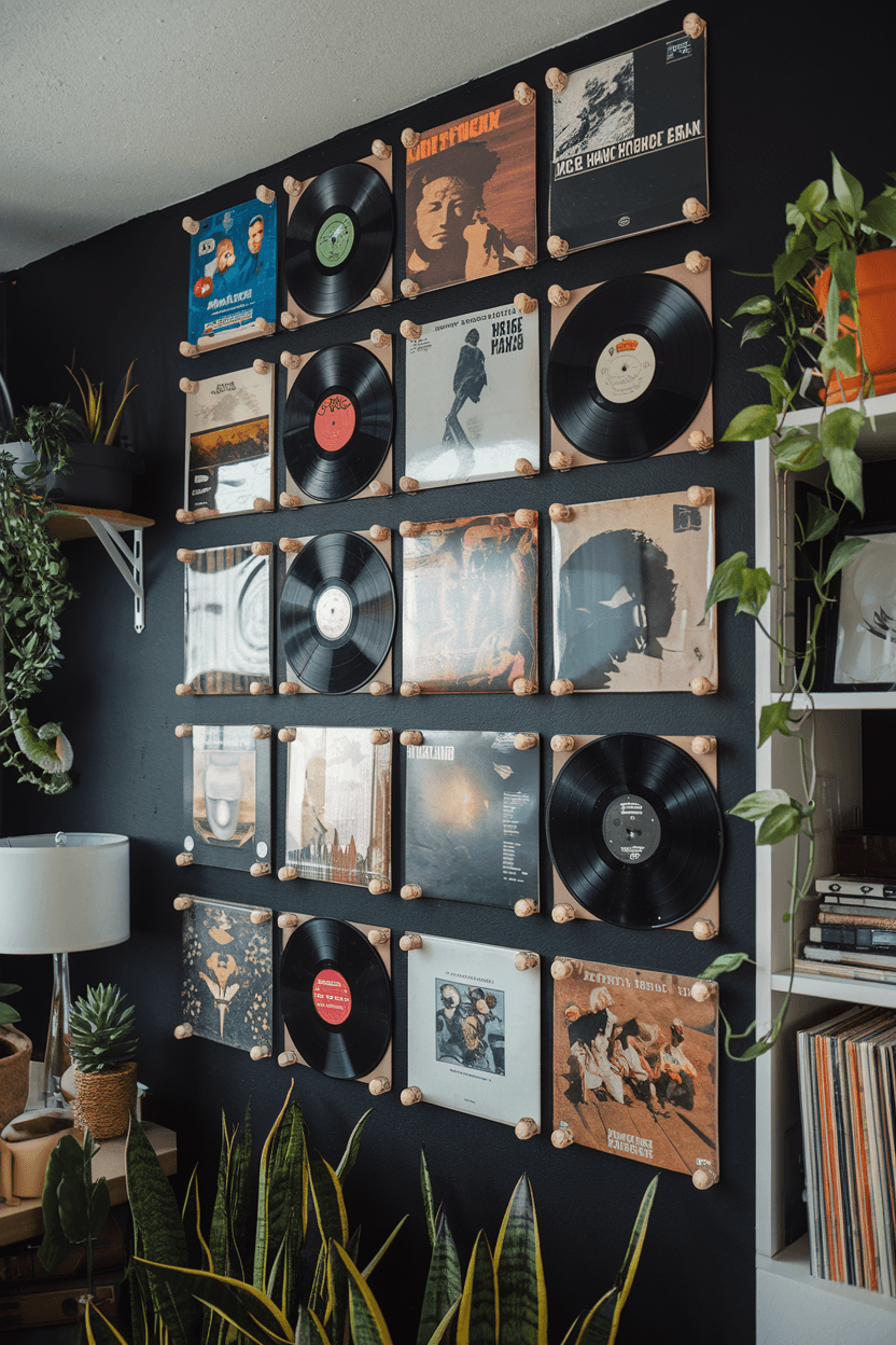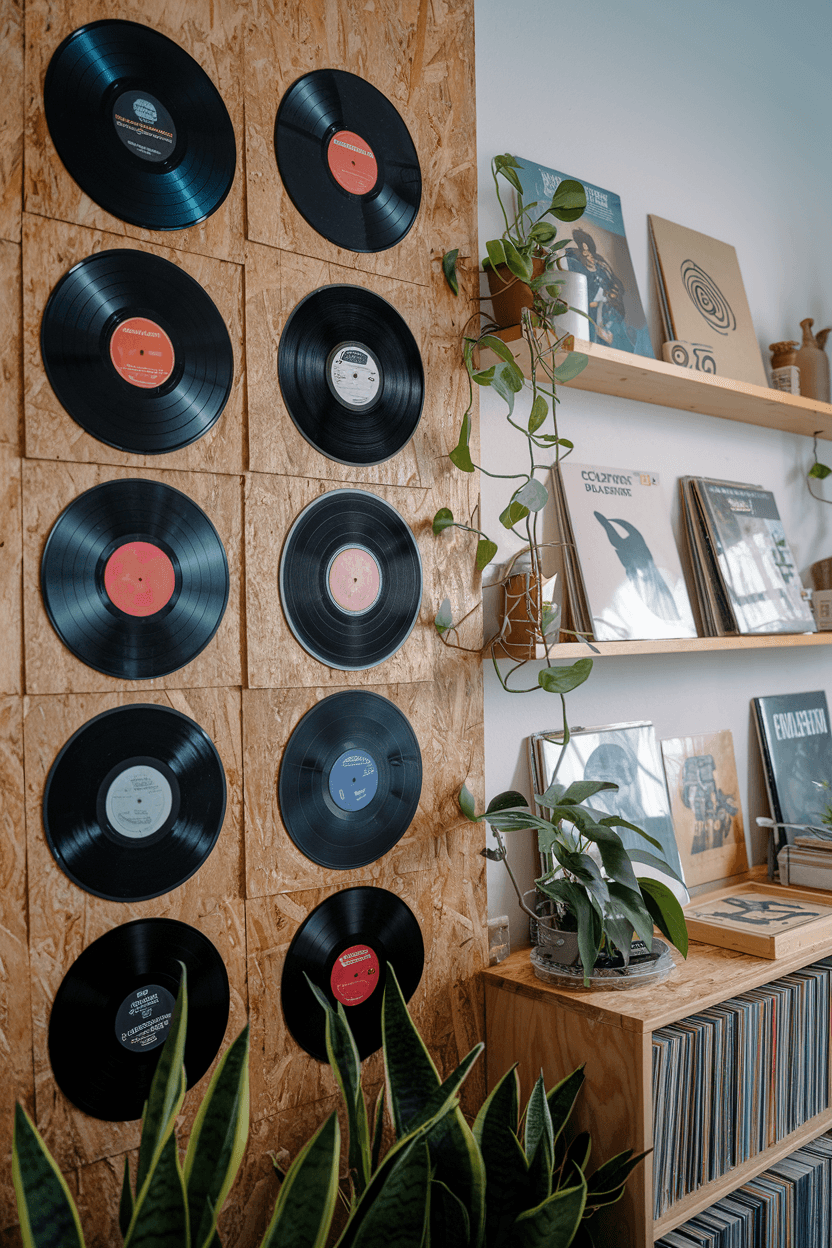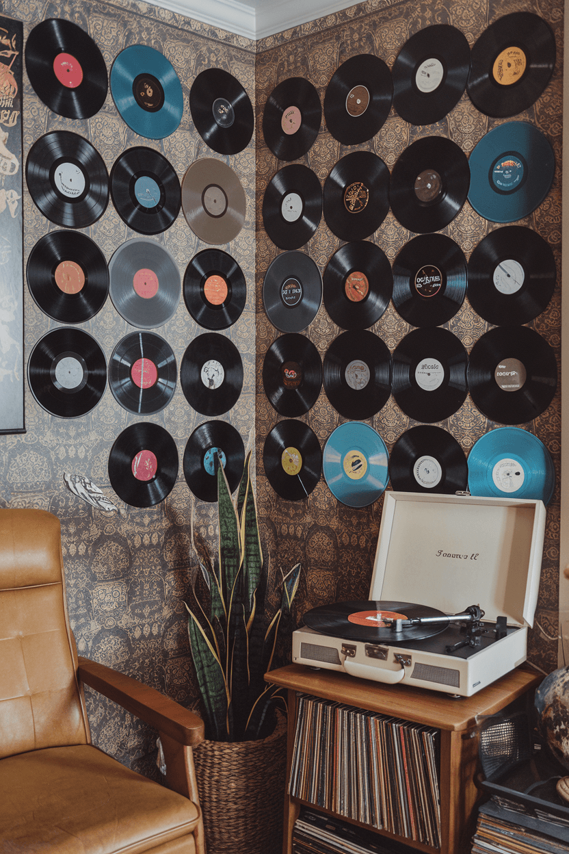 Highlight Vinyl Art: Strategic lighting can transform your vinyl wall into a luminous art piece. How about warm LED strips highlighting each record?
