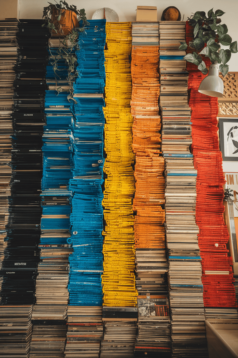 Vibrant Aesthetics: Ever noticed how color can change the mood of a room? By coordinating the color of your vinyl records, you can create an impactful display. Bright blues beside mellow yellows? Or maybe fiery reds mixed with soothing greens? The play of colors can make your vinyl wall pop.