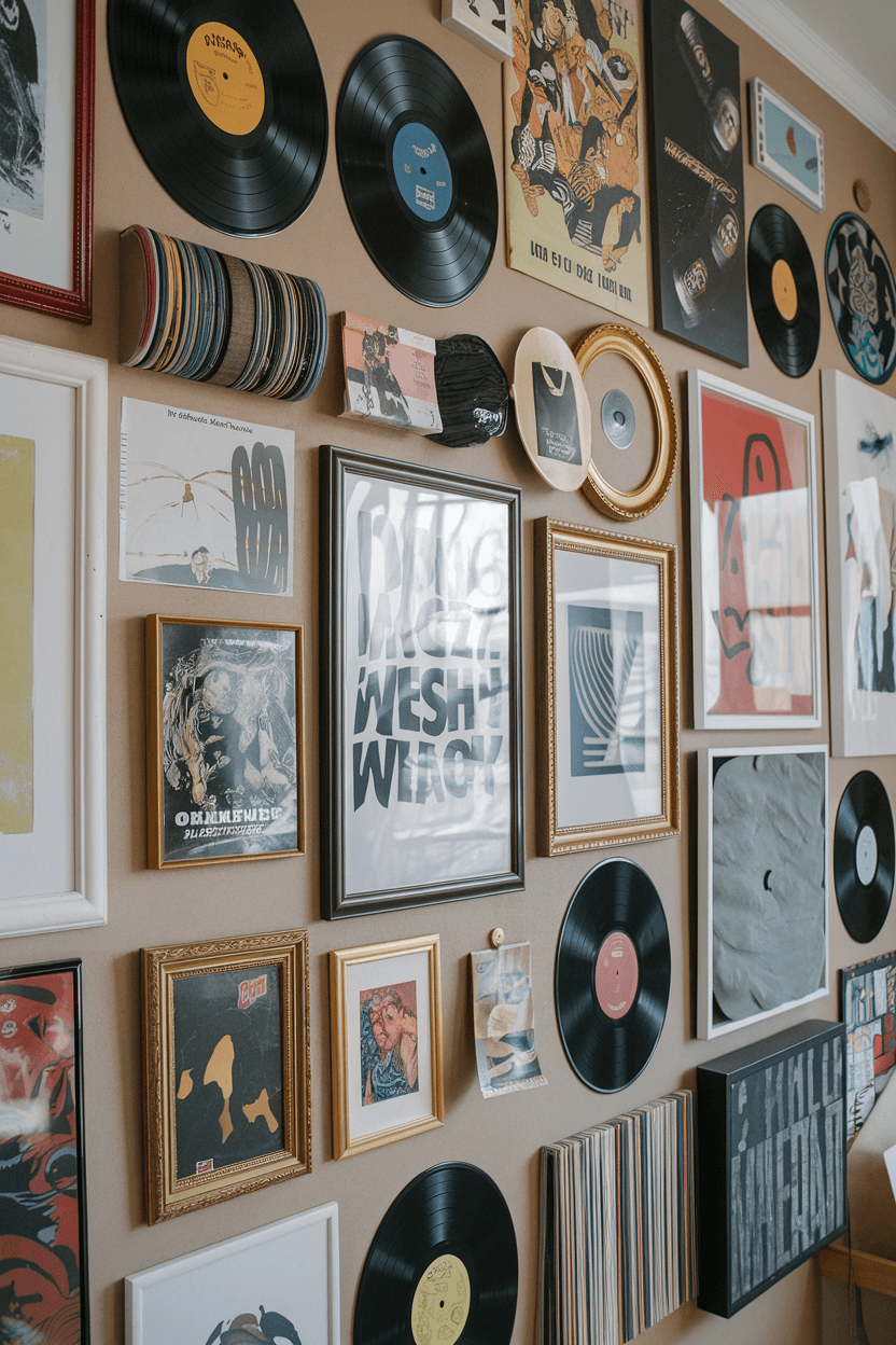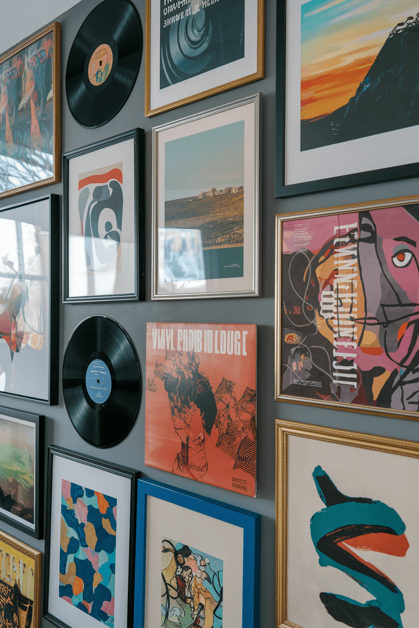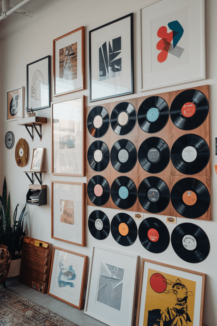 Combining Frames and Records: Why not mix vinyl records with framed art prints? It's a recipe for an eclectic vibe that many fancy.